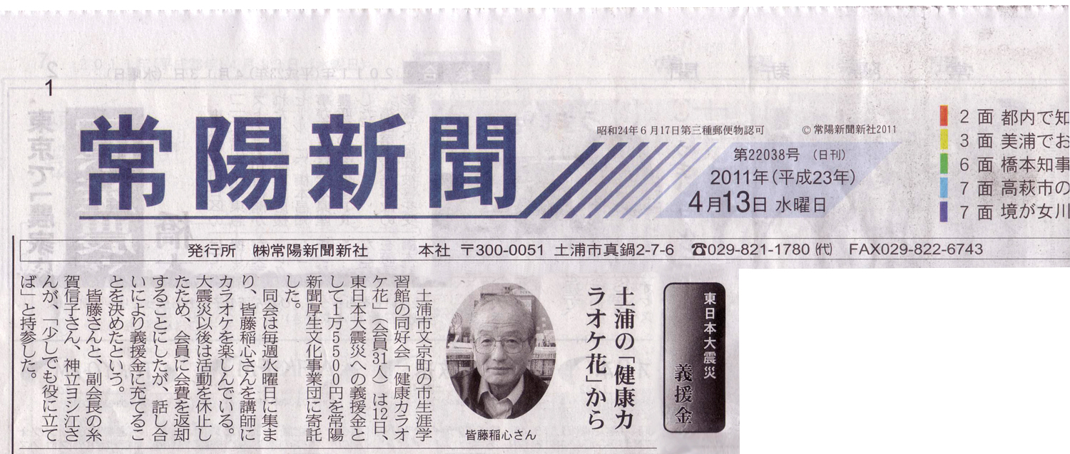 2011年4月13日に「健康カラオケ花」として、東日本大震災の義援金を常陽新聞 厚生文化事業団に寄託した際の内容が掲載されました。